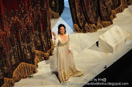 There were a lot of nervousness during the first part of the opera. Maybe it was the pressure of the evening. I couldn’t hear the voices too well. Two possible reasons. Either I was too close to the orchestra and the sound was not very well balanced or it was the place on stage they were singing from. Angela’s voice during her aria in the first act seemed like coming from far, far away. Soft, round, touching, but not powerful enough to overpass the orchestra. The director placed her on top of the stairs, towards the back of the stage. For the duet with Domingo (the father/daughter reunion) they both came in front. So things started to change. The voices already warmed up and they were closer to the audience. It was a very touching moment. The way they looked to each other, the acting and not to mention the voices. They looked exactly like father and daughter. It was one of those moments when you feel your blood pressure raising.